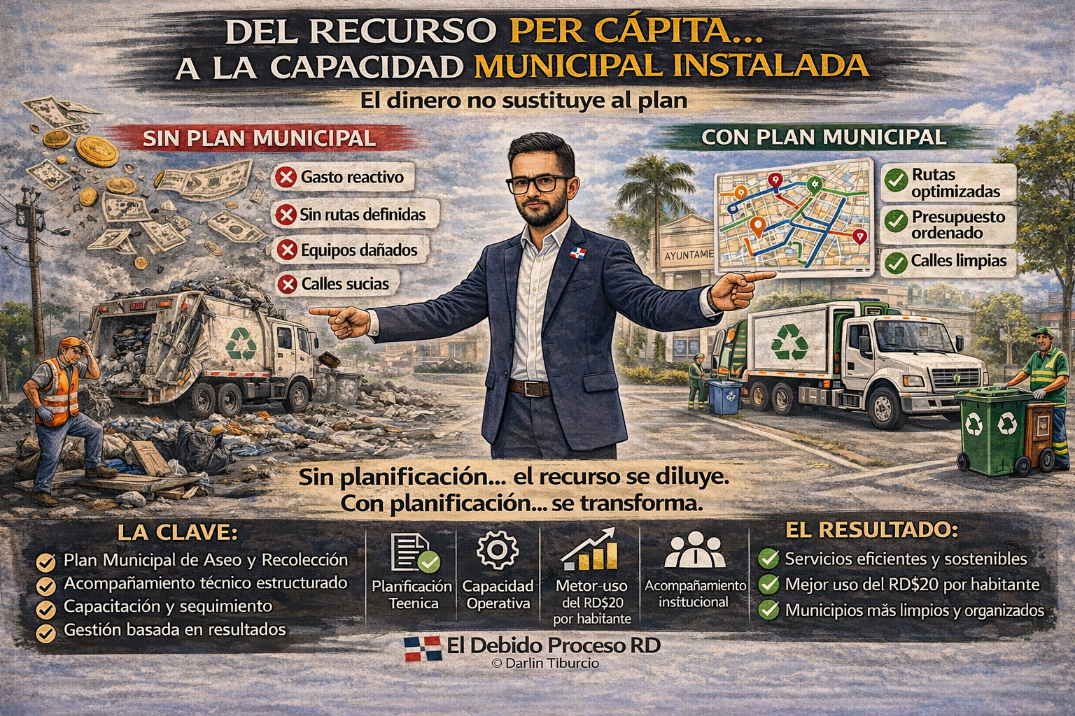 La asignación de veinte pesos por habitante representa una oportunidad concreta para los gobiernos locales, pero su aprovechamiento efectivo depende de una condición que no puede seguir siendo tratada como secundaria: la existencia de un Plan Municipal de Aseo y Recolección de Desechos Sólidos formulado, instaurado y operativamente vigente. Sin ese instrumento, el recurso per cápita pierde capacidad transformadora y se diluye en gasto reactivo, sin impacto estructural ni sostenibilidad en el tiempo.